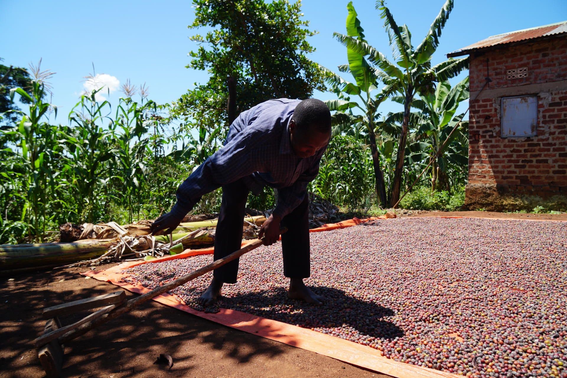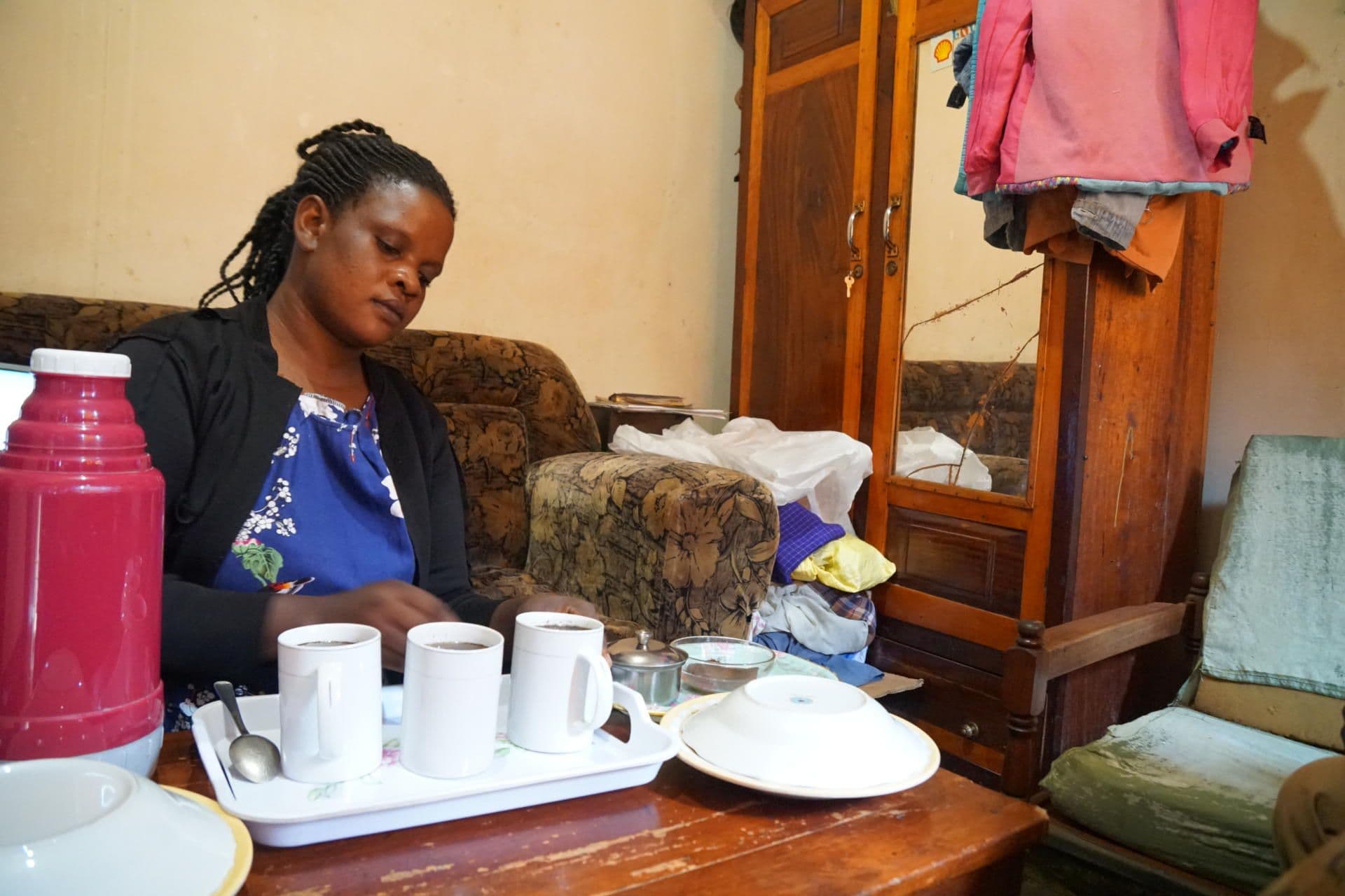 Gospel music is playing in the background while Viola sits in the families’ living room and slowly pours water into cups filled with ground coffee. After a few minutes of stirring the coffee is ready to be served. Viola tells that the coffee comes directly from the families’ coffee field: “After harvesting, we dry and process the coffee so that I can roast some of it myself and use it for the families’ consumption.” She hands over one of the cups to her husband Richard, who takes a sip and starts smiling, delighted from the result.