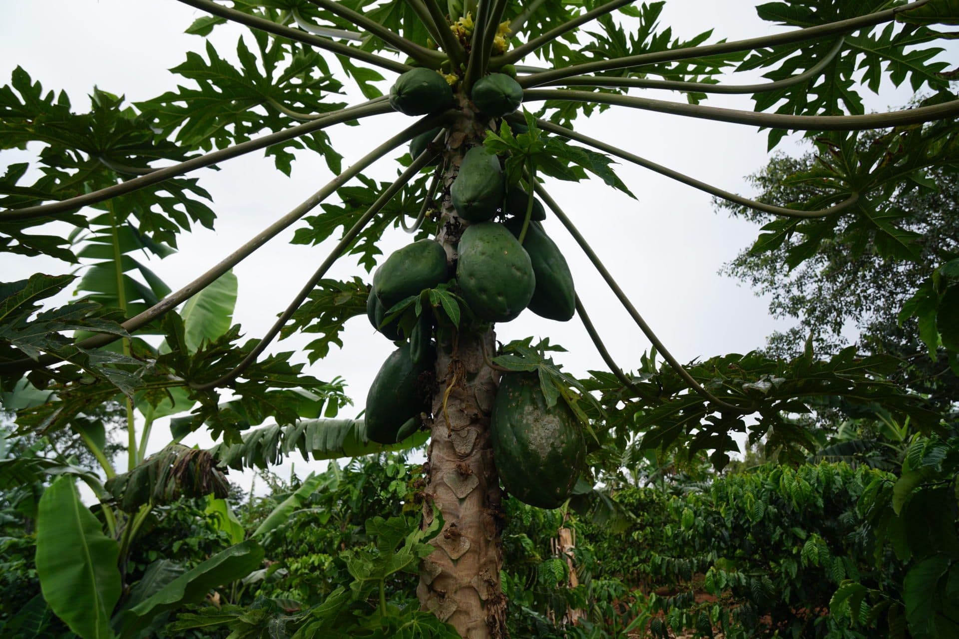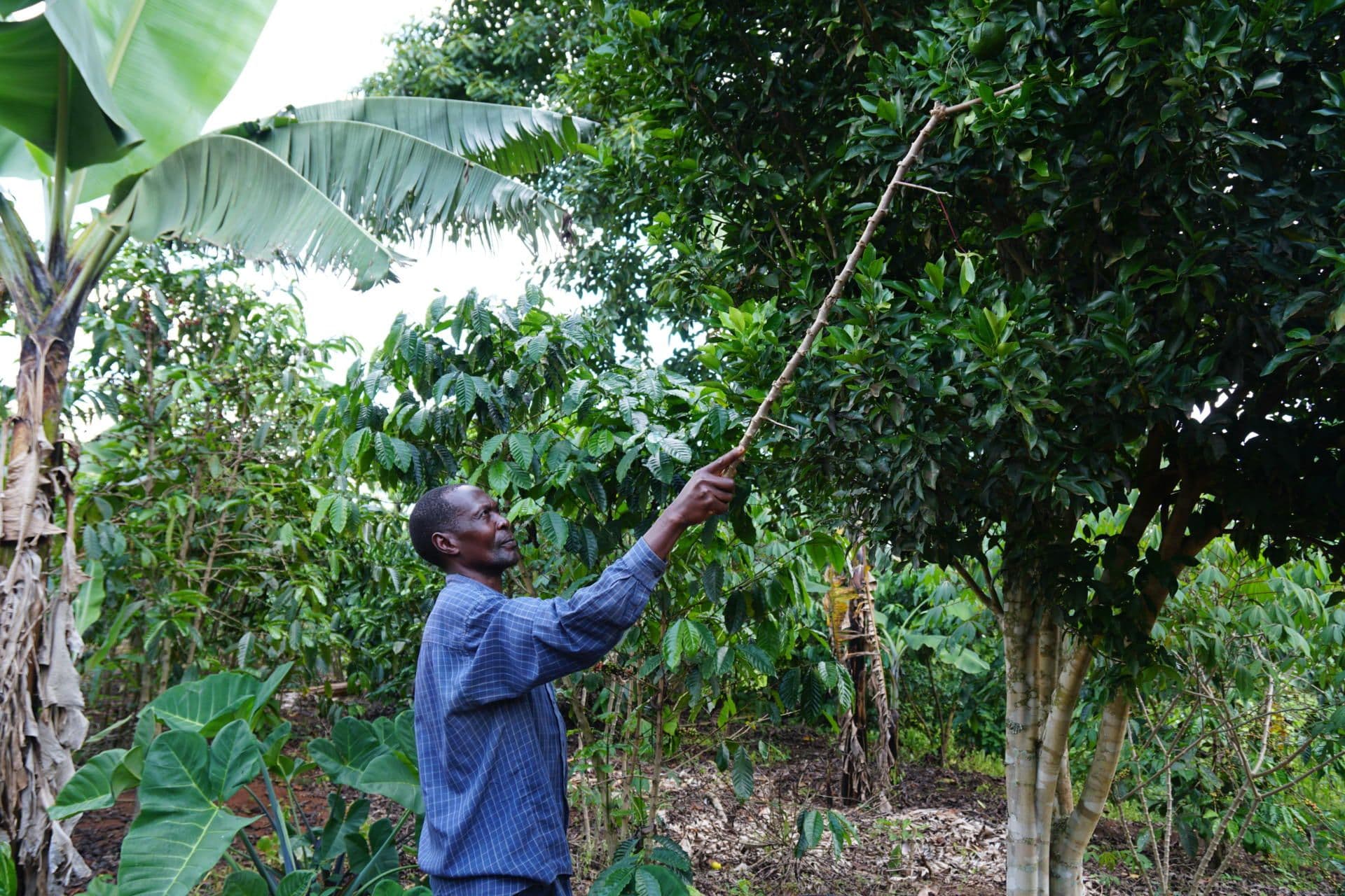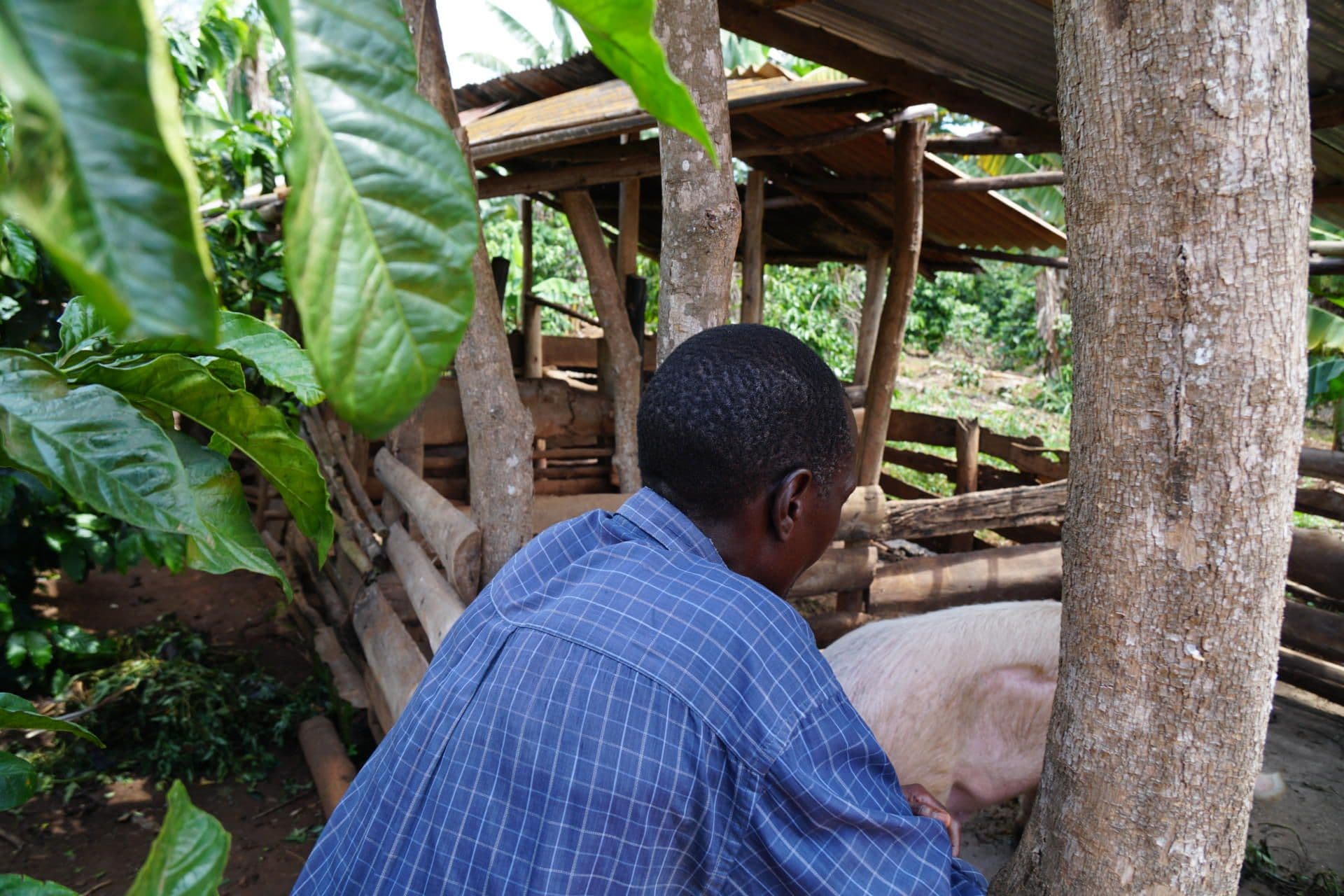 As Richard walks through his field, he starts picking various fruits, such as oranges and papayas. “Based on the higher income through enhanced productivity and better prices for my coffee, we were able to save money, which we could invest in the planting of various fruit trees”. Also, he used the savings to build a pigsty and start a piggery project. These investments do not only increase the food security of the family but also can function as a side income. Both fruits and pork can be sold on the local market. This is of particular importance in case of coffee crop failure, due to weather changes or pests and diseases.